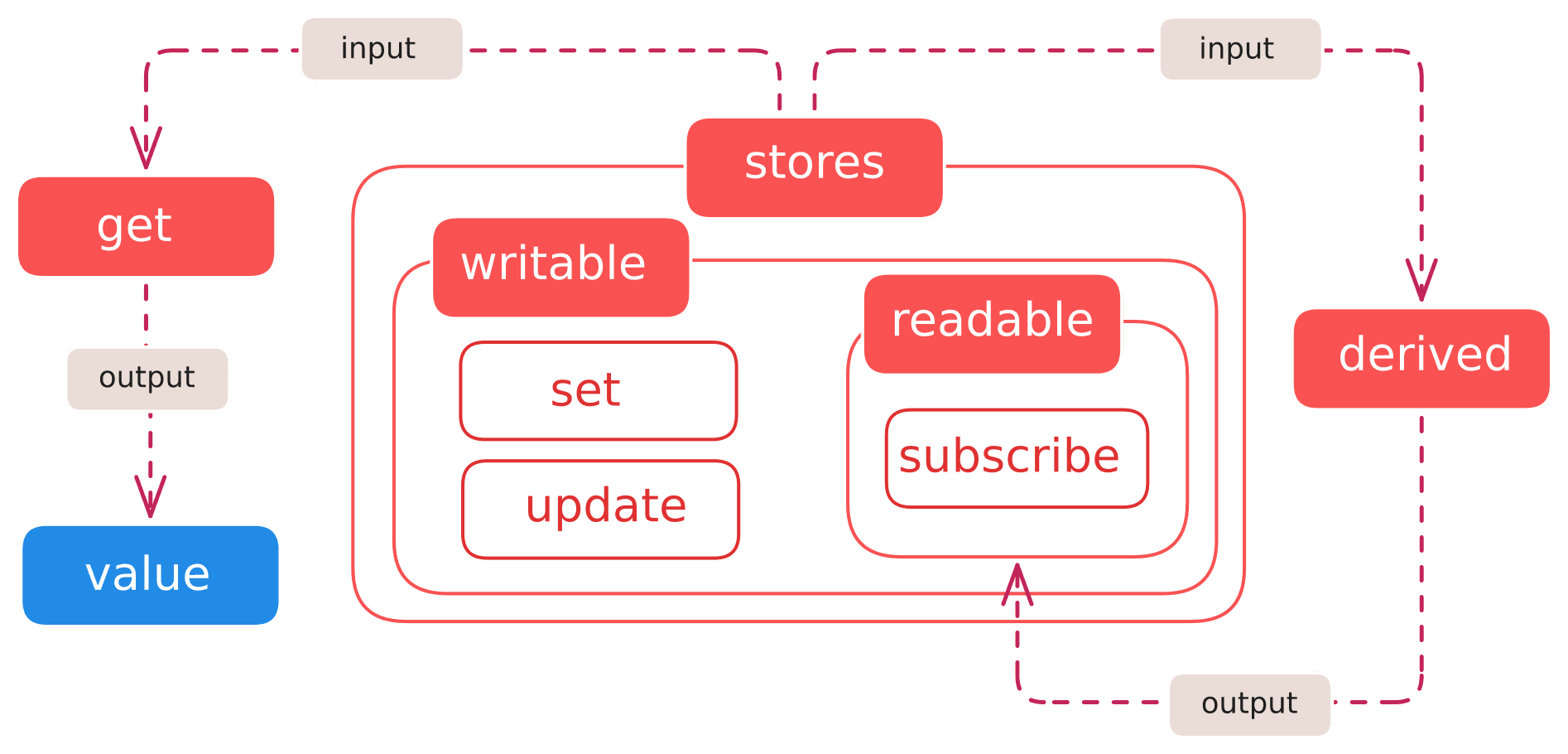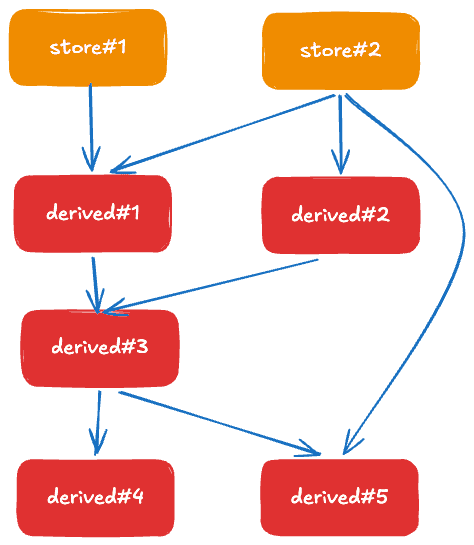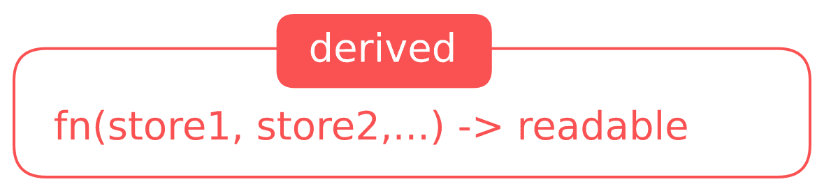 The second case involves reading values and performing some calculations on them in a utility function—hence the aptly named🥁 derived stores 🥁. Derived is a cousin to readable store, which can be represented as